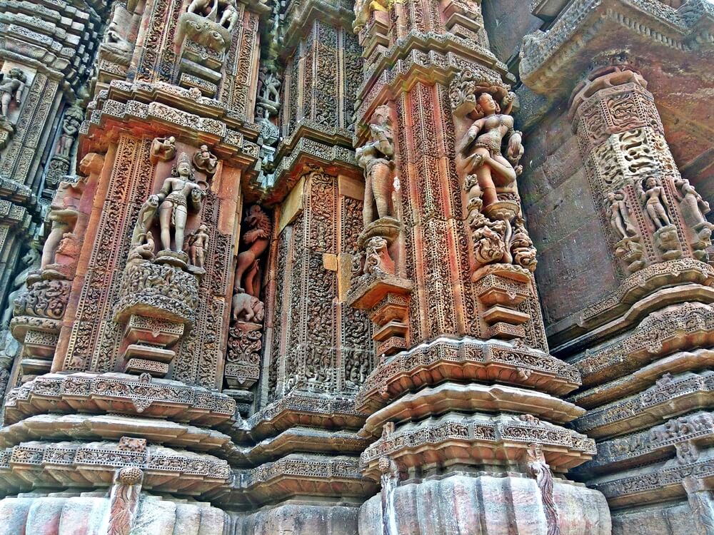 There is an archway in front of the temple which has sculptures of monkeys and floral carvings along with few other sculptures. The walls of the temple and the temple precincts has many sculptures of women with distinct facial expressions with attention to hairstyles and jewelry. There is a lion sculpture atop the entrance of the jagamohana. There are many other idols and sculptures as well, but it is extremely difficult to figure them out without a guide.