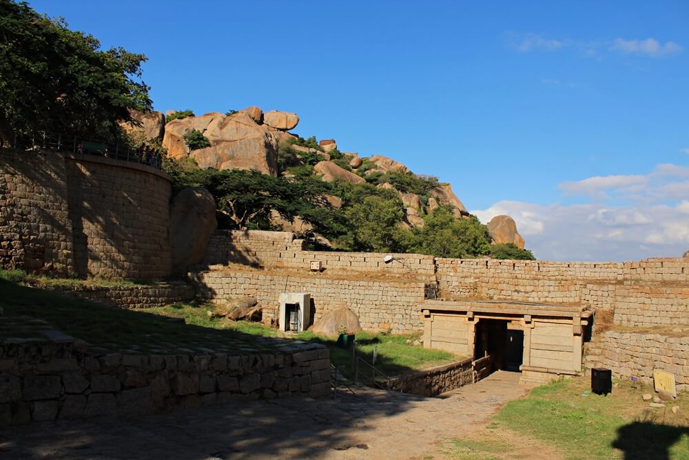 Owing to its geographical location, the fort remained impregnable and served multiple rulers all of whom have left their unique imprint that can be seen across the architecture of the fort. The fort has an interesting architecture that resembles a serpentine and has meandering passages and high ramparts. Multiple anecdotes that add to the fascination of the fort, the most popular being the legend of Obavvana Kindi, the story of a brave woman who slew multiple soldiers of Hyder Ali. The fort is strategically and scientifically built to accommodate granaries, water tanks, oil pits, places of worship, a network of secret passages and water harvesting systems. The fort has both Hindu and Islamic features which were added in course of the illustrious history of the fort between the 10th and the 18th century which spanned across multiple dynasties including the Rashtrakutas, Chalukyas, Hoysalas, Nayakas and later Hyder Ali and Tipu Sultan. Within the fort, there are 18 temples including the famous Hidimbeshwara temple and also a mosque which was added during the reign of Hyder Ali.
